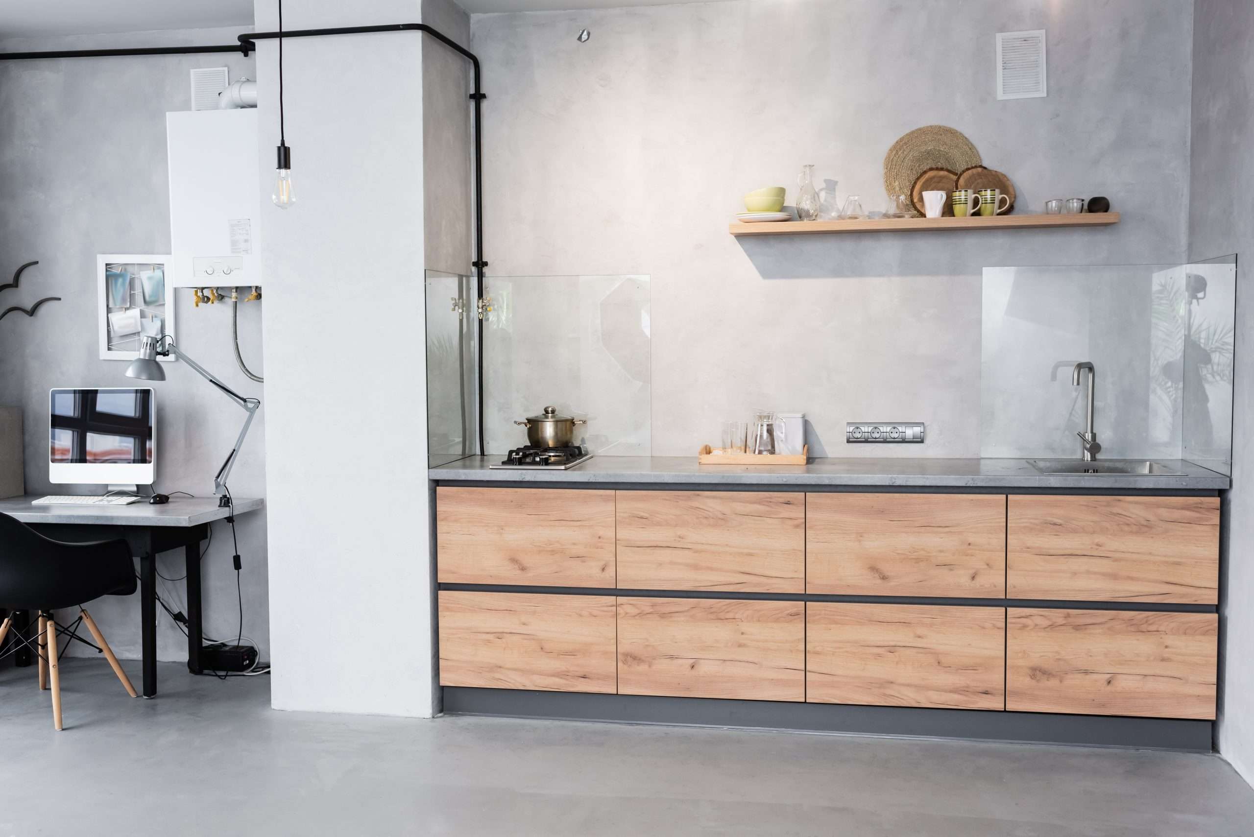 Spacious kitchen and workplace with computer, chair and lamp